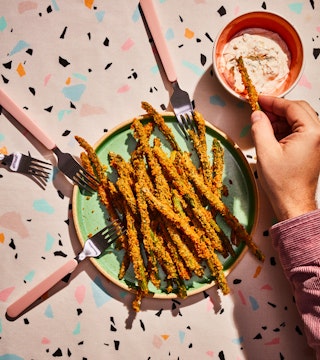 Asperges frites, trempette à la mayonnaise, à la crème sure et aux herbes