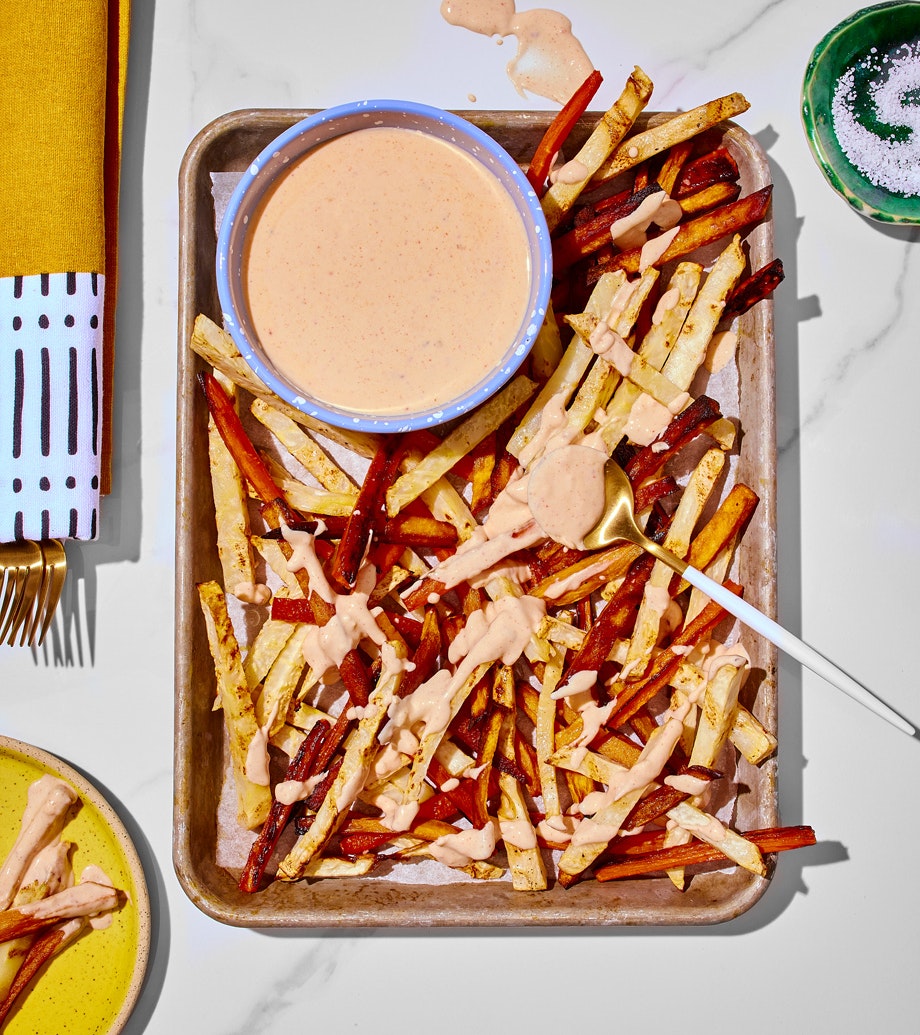 Frites de légumes au four, sauce au cheddar et au piment chili