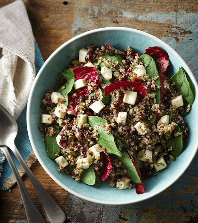 Salade de quinoa aux épinards, graines de citrouille et fromage