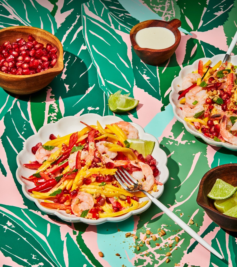 La salade peut être faite quelques heures à l’avance et réfrigérée. On ajoutera alors la crème, le piment, les arilles de grenade et les arachides seulement au moment de servir.