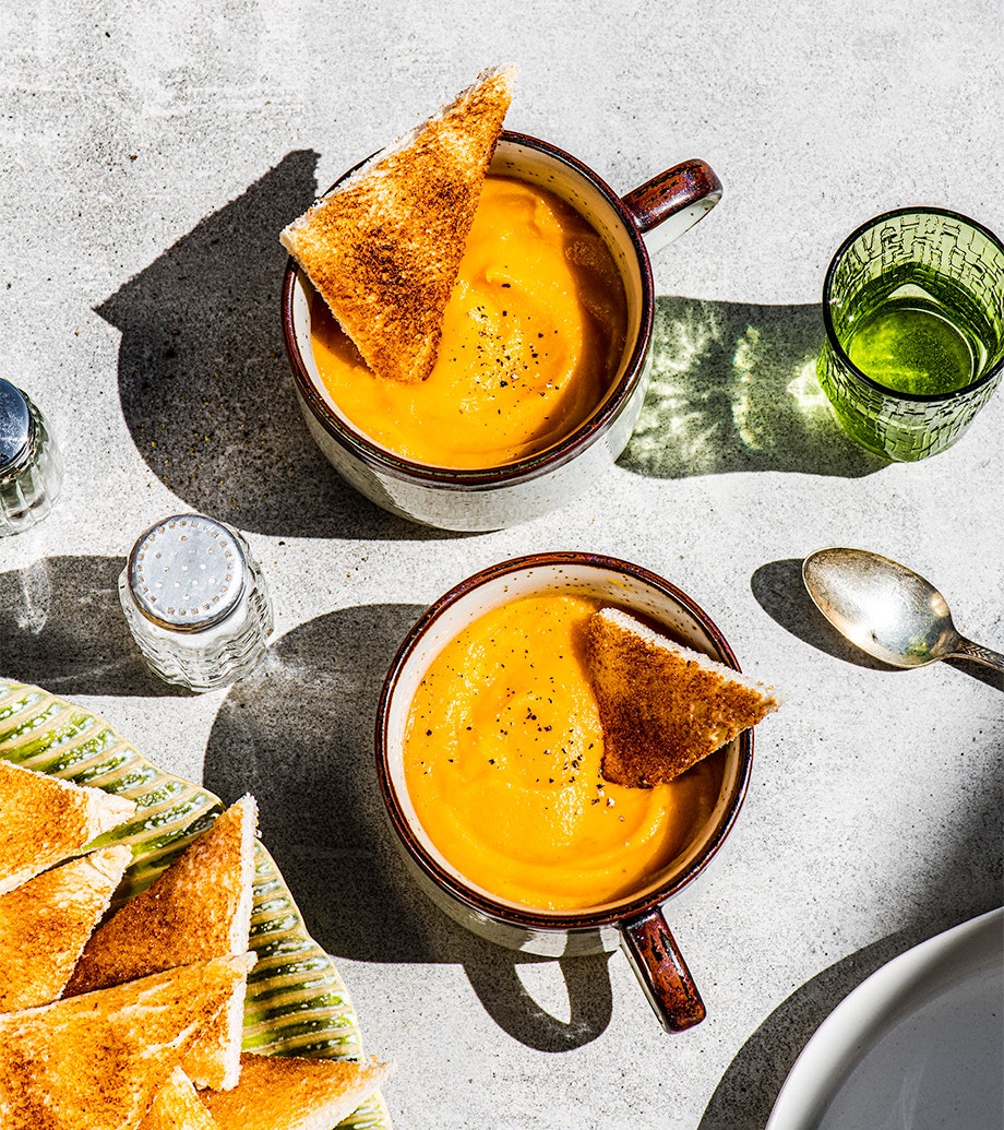 Servir la soupe avec des triangles de pain blanc rôti/beurré