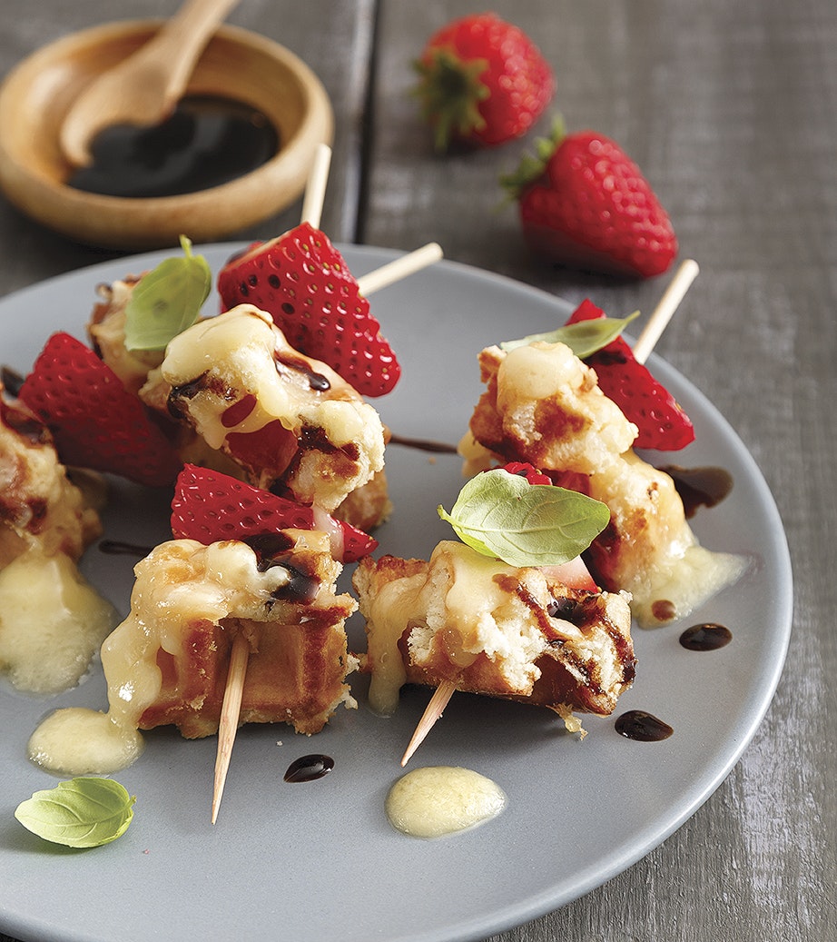 Remplacer les fraises par des quartiers de pommes, et le caramel de vinaigre balsamique par du dulce de leche ou du caramel à la fleur de sel.