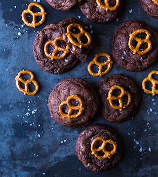 - Congeler les boules de pâte crues sur une plaque à pâtisserie à la fin de l’étape 6, avant de transférer dans un sac hermétique refermable. Laisser décongeler 10 minutes sur une plaque à pâtisserie recouvert de papier parchemin, placer un mini bretzel sur chaque biscuit en appuyant légèrement, avant de les cuire au four. Saupoudrer d’un peu de fleur de sel. Ajouter 2 à 3 minutes au temps de cuisson.