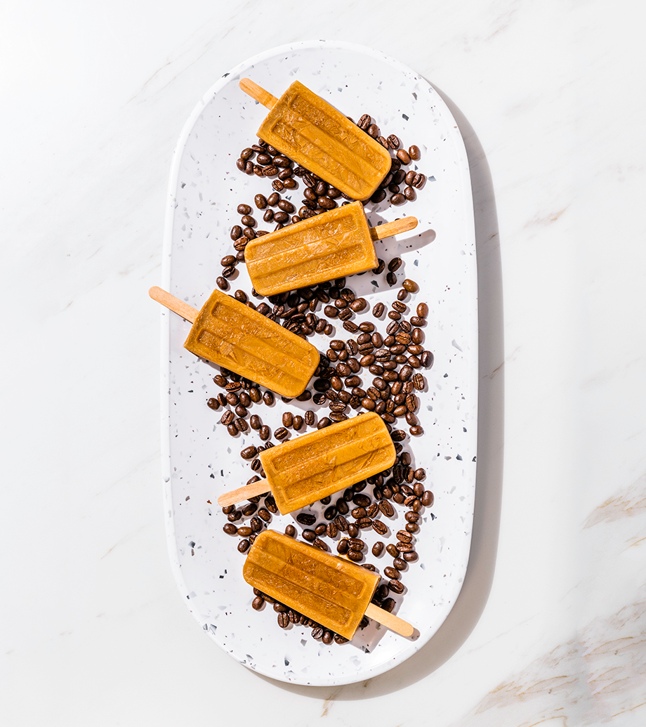 Une fois démoulées, on peut tremper les sucettes de café glacé dans du chocolat fondue, puis garnir de noix hachées, de noix de coco râpée ou de biscuits au beurre hachés.