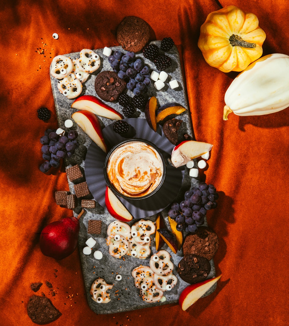 Pour faire un plateau-dessert d’Halloween comme celle de la photo, accompagner les bretzels et la trempette des éléments suivants, au choix : quartiers de pomme et/ou de prune, raisins noirs en petites grappes, biscuits au chocolat et guimauves miniatures.