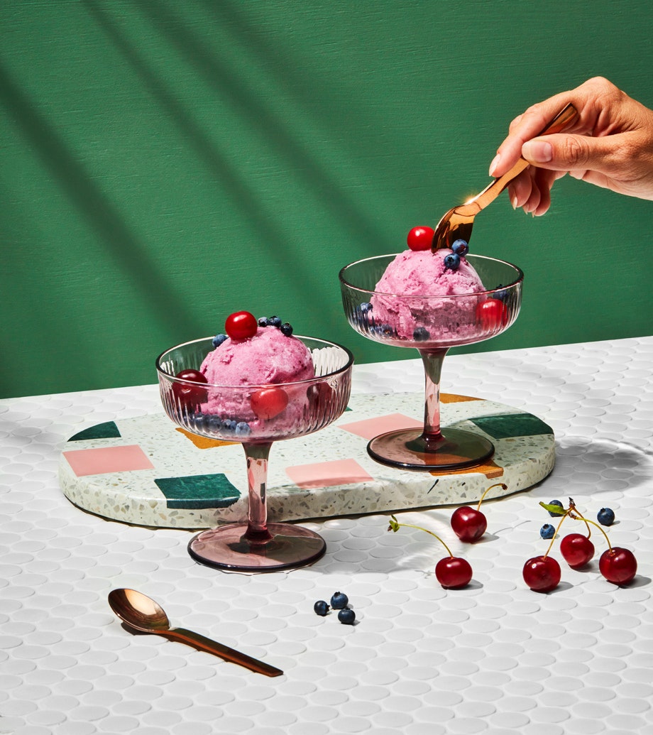 Au congélateur, la glace durcit. Avant de la servir, il est conseillé de la mettre en morceaux et de la mélanger à l’aide d’un robot culinaire.