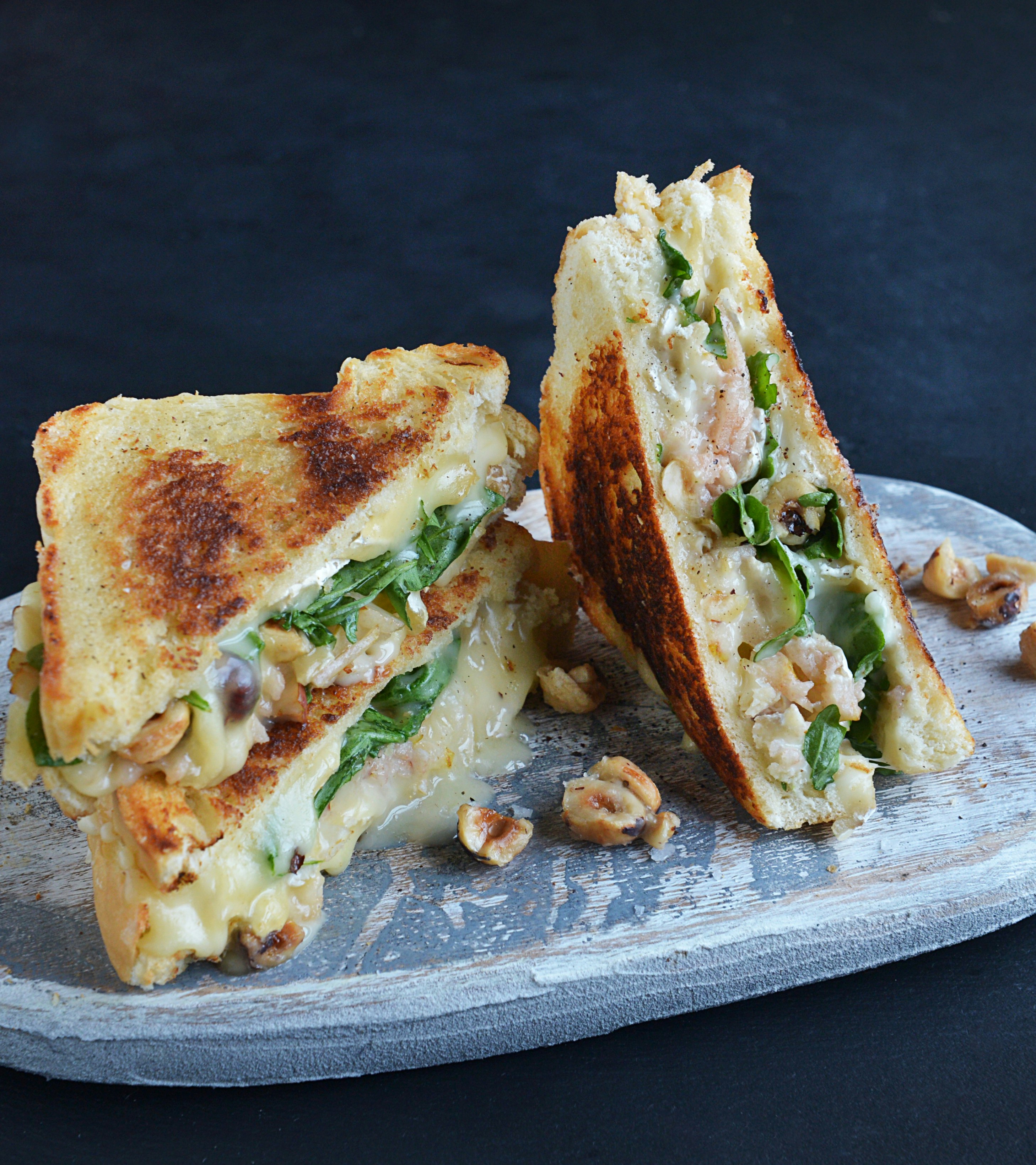 Grilled cheese aux noisettes caramélisées, poires et roquette