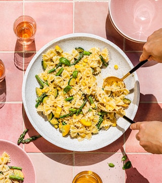 Pâtes aux courgettes, asperges et maïs, sauce à la crème