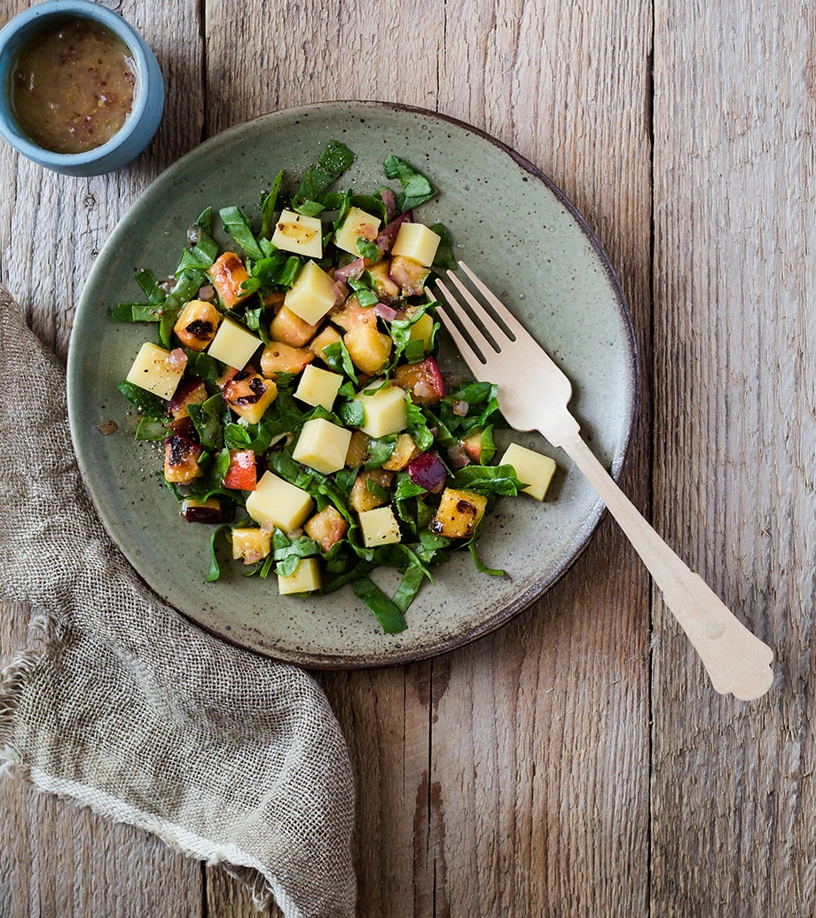 Salade de pêches grillées et fromage, vinaigrette au miel et livèche
