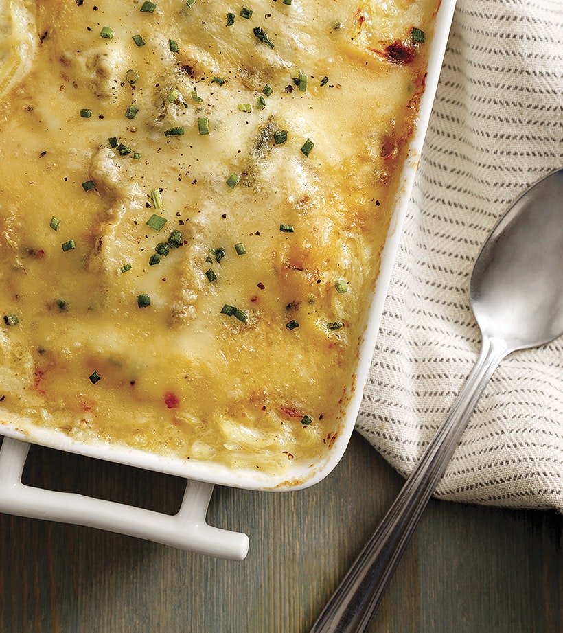 Garnir le gratin de courge d'une julienne de pommes fraîches, de noix rôties et/ou de jeunes pousses de roquette.