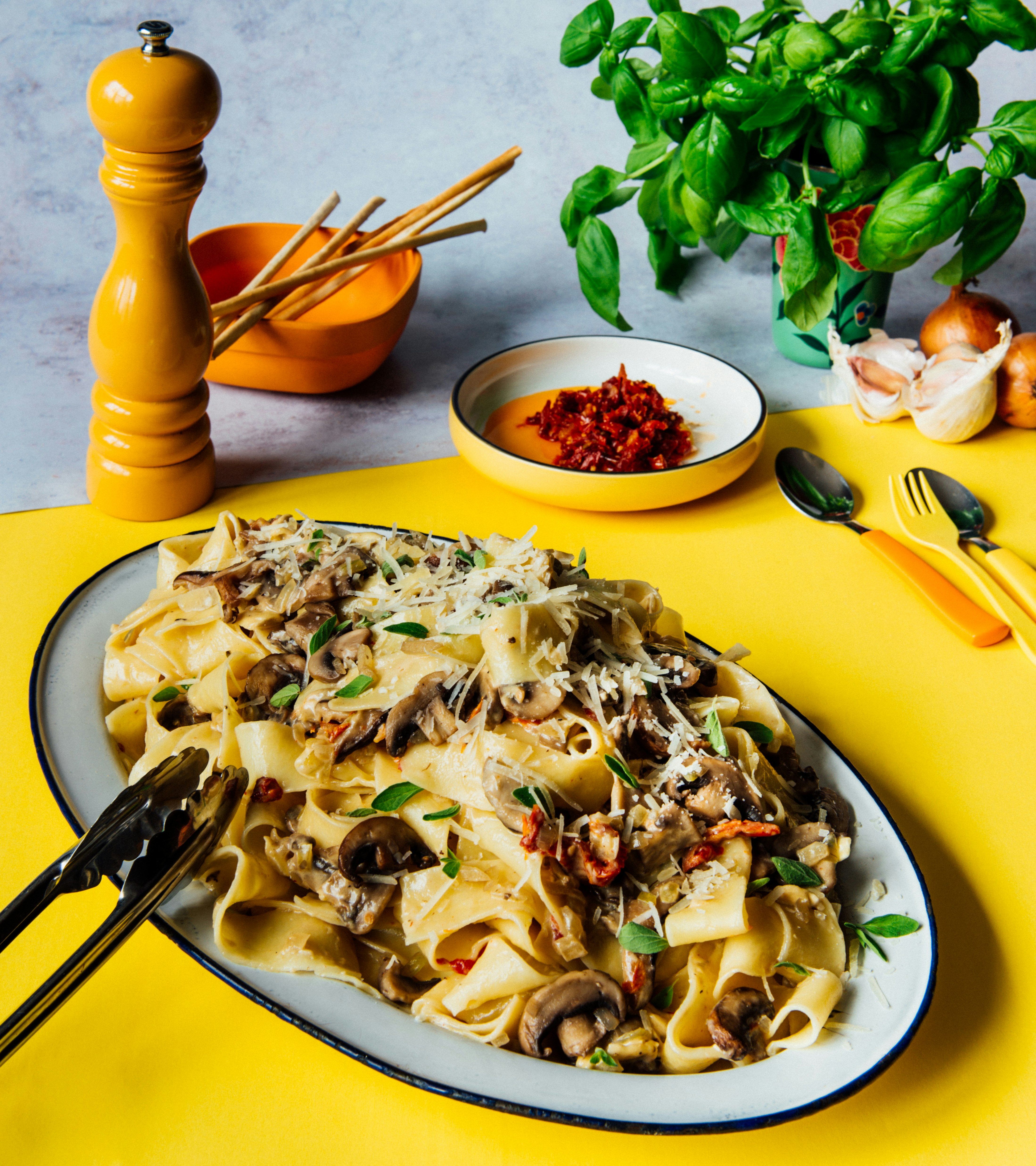 Pâtes pappardelles aux champignons sauvages et tomates séchées