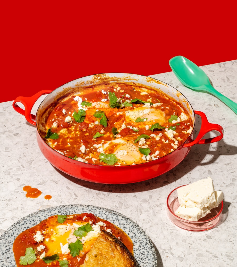 Cette recette qui se rapproche d'une chakchouka est idéale pour un brunch. Des œufs cuits dans une sauce aux poivrons et aux tomates, quoi de mieux?