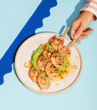 Brochettes de crevettes à l’orange et purée de pommes de terre aux petits pois