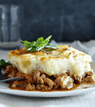 Hachis de poulet, purée au fromage et garniture d’herbes