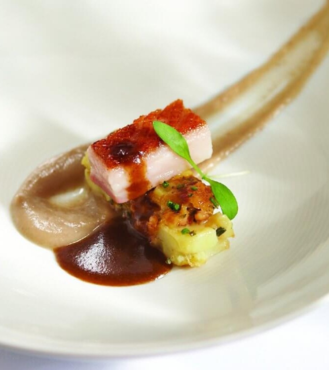 Tartiflette de pommes de terre rattes aux lardons et au Victor et Berthold, flanc de porc braisé au cidre de pomme Chemin du Minot, purée de panais au sucre à la crème