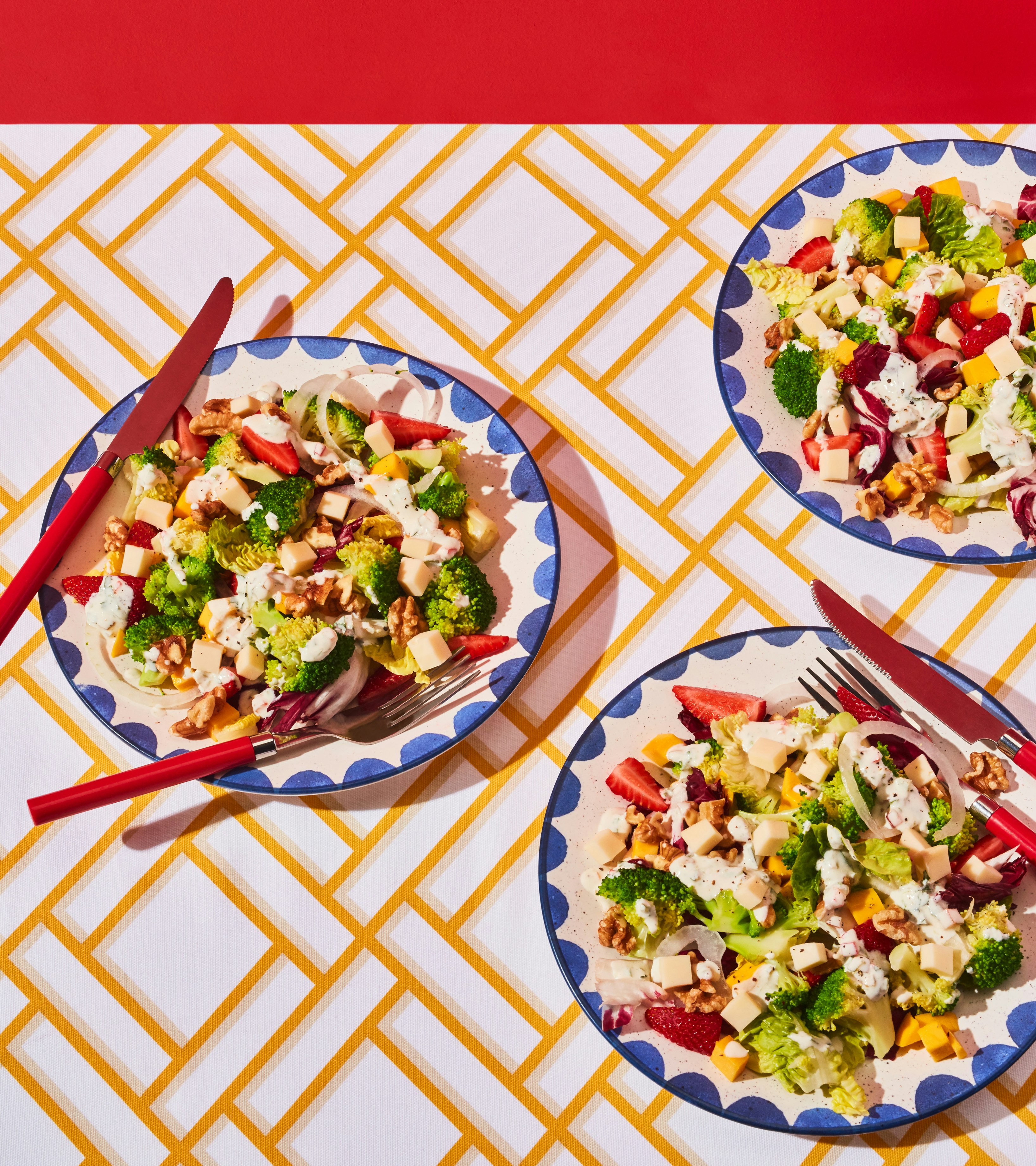 Salade aux fraises, à la mangue et au brocoli, vinaigrette crémeuse à la coriandre