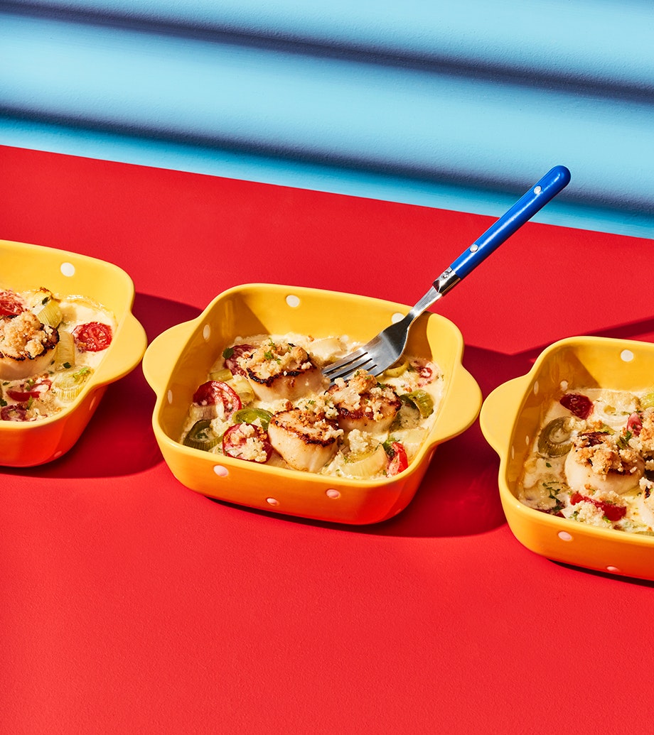 Pétoncles à la crème de poireau accompagnés d'un croustillant d'amandes et de fromage