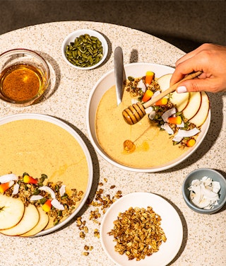 Qui a dit que la citrouille ne servait qu’en décorations ou en plats qu’on mange après 17h? Si on rencontrait cette personne, on lui montrerait notre bol smoothie à la citrouille comme déjeuner. Se réveiller avec l’automne dans un bol? C’est oui. Le mélange yogourt grec nature-purée de citrouille-mélange de cannelle, muscade, gingembre et clous de girofle nous fait tellement de bien qu’on a presque envie de réciter un slam avec ses ingrédients. Question de répandre la bonne nouvelle au voisinage, tout simplement.