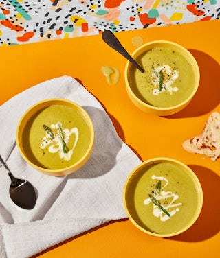 Vous appelez affectueusement un champignon « le diable avec un ti-chapeau », l’asperge « le crayon mou des aliments », et vous ne toucheriez pas la laitue iceberg, même avec votre petit doigt? Cette année, que diriez-vous de vous donner le défi de fraterniser avec trois ennemis jurés en un seul repas? On a une recette de velouté qui rassemble asperges, champignons et laitue iceberg. Et quoi de mieux qu’un velouté, qui nous conquit déjà par sa texture onctueuse, pour déguster ce qu’on tasse immédiatement dans le coin de l’assiette? La beauté des potages, soupes et veloutés, c’est que ce sont les saveurs au premier rang. Commencez par les saveurs de vos légumes antagonistes et vous tenterez leur texture par la suite. Vous verrez, vous allez nous remercier après avoir concocté cette recette. 2021 débutera sous le signe du renouveau, et vous allez probablement reconsidérer vos goûts (et vos surnoms) en accomplissant cette résolution. Lancez-vous!