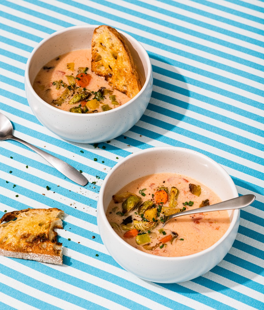 Tandis que je tranche mon céleri et mes carottes, je me rends compte que je me suis complètement perdu dans mes pensées. Je fais la connaissance du rutabaga en prenant conscience de sa texture, de son odeur, de sa personnalité. Je me rends compte que je savoure rarement ces petits moments de solitude. Il n’y a pas grand-chose de plus réconfortant que de couper de généreux cubes de beurre pour ensuite les voir fondre tranquillement dans le chaudron. Par contre, le mérite de toute la magie revient assurément à la crème 10 %, lorsqu’elle se mélange aux légumes et que les tomates lui donnent sa couleur rosée.