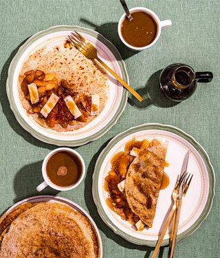 Conseil de la maison : Utilisez votre recette de crêpes préférée et ajoutez simplement un peu plus de lait qu’à l’habitude. Cela vous permettra de réaliser des crêpes plus fines et plus légères, histoire que le résultat final ne soit pas trop bourratif. Et par chance, peut-être aurez-vous un peu de place pour une deuxième portion!