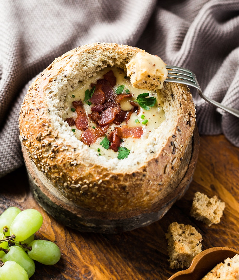 Il n’y a pas que la soupe qui se mérite une place dans des bols en pain! Pourquoi ne pas pimenter votre soirée fondue en remplaçant le traditionnel caquelon par des petites miches bien rondes au centre de la table? Recommandations de la maison : variez les pains pour vos bols. Osez les miches multigrains, au levain, de campagne… Et pour les fans de fromage, un pain au cheddar. Comme quoi, tout est dans tout.