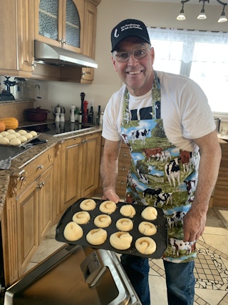 Pierre Montplaisir n’a pas été pris au dépourvu, lui. Ce producteur de lait de Bécancour faisait son pain maison bien avant que ça devienne tendance sur Pinterest. Il était donc équipé, en provisions et surtout en techniques : il a appris à pétrir la pâte à l’âge de 14 ans. « À l’époque, ma mère faisait des gâteaux de noces de 4 ou 5 étages, avec des fontaines et des fleurs. Ses p’tits pains sucrés étaient tellement bons que j’ai décidé d’apprendre à en faire. Une seule recette c’était pas assez parce qu’on était 11 enfants ! », raconte-t-il avec enthousiasme.