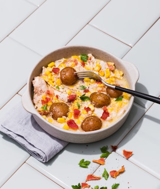 On y va donc avec le poulet au bacon et maïs. Que ce soit pour vider votre frigo ou pour faire une épicerie avec un budget précis, cette recette mijotée se fera un plaisir d’être conservée au frigo pour les repas de semaine. Ce qui a de beau avec ce poulet-réconfort-deluxe, c’est que tous ses ingrédients sont à portée de main. Maïs, patates, bacon, oignons… et si vous voulez faire votre sauce Alfredo, libre à vous. Sinon, une sauce du marché peut facilement faire l’affaire.