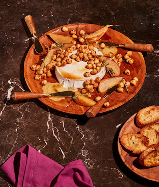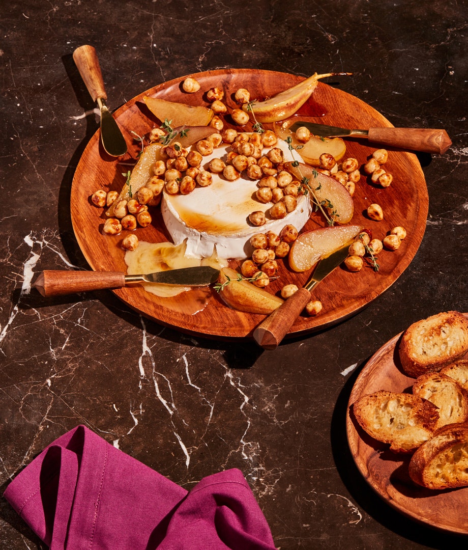 Une meule entière de camembert à l’apéro, c’est déjà beau. Une meule entière de camembert chaud et coulant, garnie de poires pochées et d’une louchée de caramel de sirop d’érable, balsamique, thym et noisettes c’est… un camembert qui s’est habillé pour rivaliser avec la dinde. Pourrait occasionner des oh, des ah, et la jalousie des atocas.