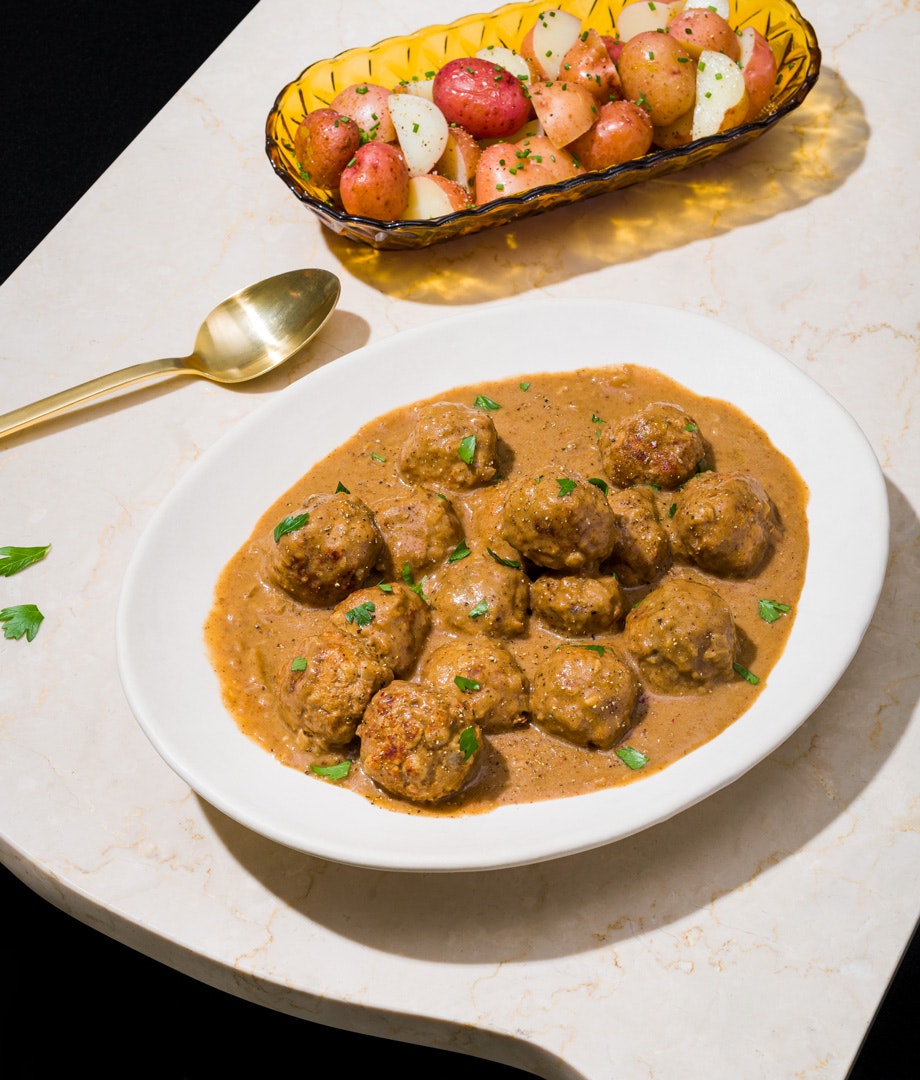 Qui n’a jamais redemandé une portion de ragoût dépose la première boulette dans l’assiette. Et cette année ne fera pas exception; avec ces boulettes de dindon juteuses (qui remplacent habilement l’imposante volaille au four si ça vous intimide), vous risquez de prendre un à-côté de riche sauce aux parfums grillés et relevés de cannelle et d’épices. Aucun cadeau n’accote ça (sauf si le cadeau est une autre portion).