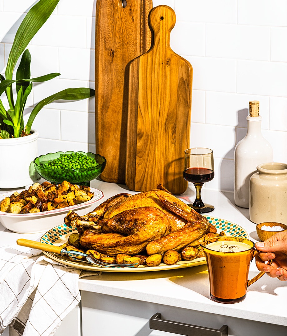Ahhh, maîtriser l’art de la dinde juteuse n’est pas simple! En guise de rappel : arroser la dinde avec du jus de cuisson aux 15 minutes. Aussi, si vous voyez qu’elle commence à brunir un peu trop à votre goût, placez un papier d’aluminium à l’endroit désiré. Cette technique permet de conserver une belle peau dorée, mais pas cramée. Pour garder la chaleur et les saveurs de la volaille en la sortant du four, couvrez (encore une fois!) votre dinde d’un papier d’aluminium. Finalement, attendez de 20 à 25 minutes avant de la servir à vos invités.