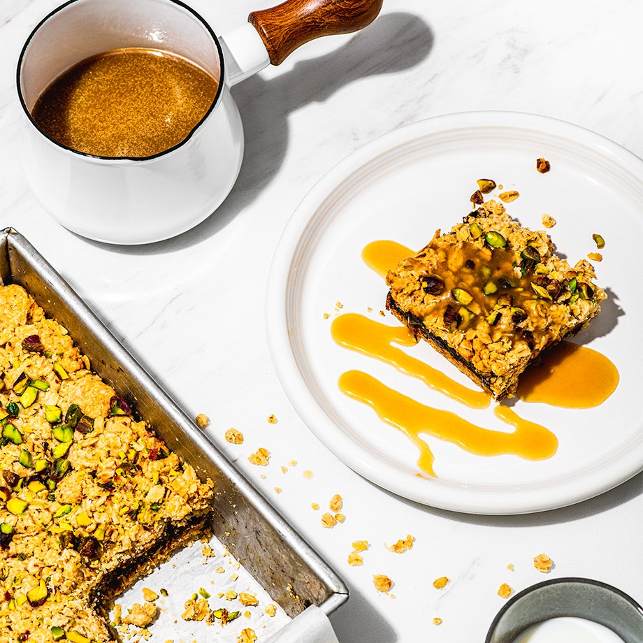 Carrés aux dattes aux pistaches avec sauce à l’érable