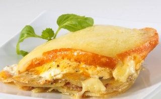 Tartiflette de pommes de terre rattes aux lardons et au Victor et Berthold, flanc de porc braisé au cidre de pomme Chemin du Minot, purée de panais au sucre à la crème
