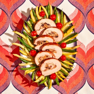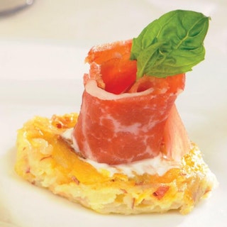 Rosette de prosciutto sur latkas de pommes de terre et fromage Le Curé Labelle