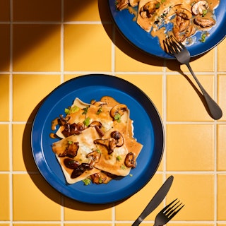 Raviolis au fromage La Récompense et sa bière Aphrodisiaque, bouillon de volaille
