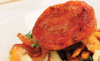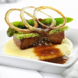 Polenta crémeuse et longe de veau, aromatisées au fromage Le Gré des Champs, avec jus de veau au vin rouge et échalotes frites
