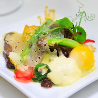 Poêlée de champignons, mousse de fromage Le Monnoir, œuf 63 degrés