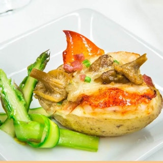 Pommes de terre farcies au crémeux d’OKA à l’ail confit, fricassée de homard et de champignons sauvages, rubans d’asperges aux herbes fraîches et au citron