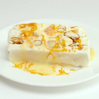 Parfait de labneh et nougat, sauce au chocolat et orange