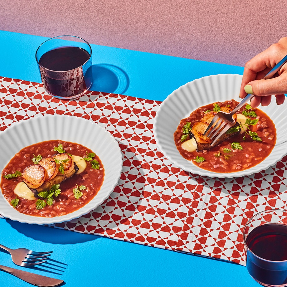 Pétoncles saisis, roulades d’aubergine au camembert, sauce aux échalotes