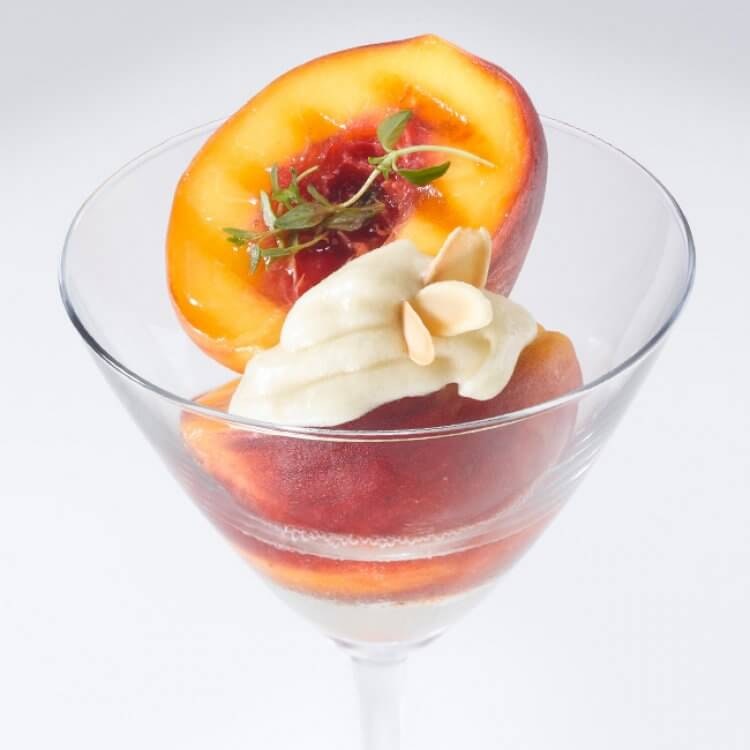 Pêches grillées au brie d’ici et croquant d’amandes