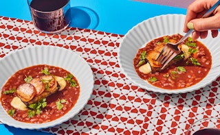 Pétoncles saisis, roulades d’aubergine au camembert, sauce aux échalotes