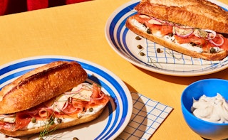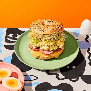 Sandwich bagel aux œufs, au saucisson et au fromage