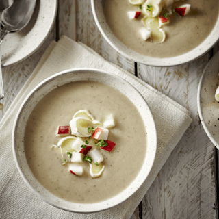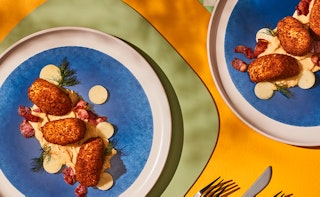 Croquettes de fromage, purée d'oignons caramélisés, bacon et pomme