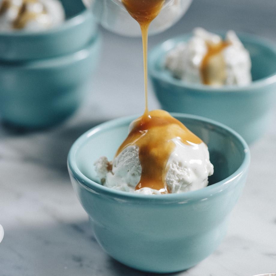 Crème glacée au brie, sauce caramel à l’érable