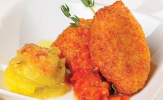 Croquettes de morue au Grondines sur concassé de tomate et gratin de courgettes