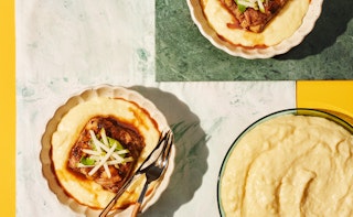 Cubes d’effiloché de porc braisé à la bière et aux pommes et son aligot