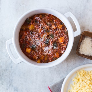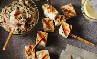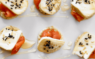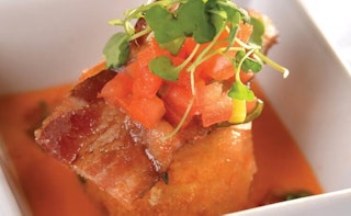 « BLTF », velouté crémeux de tomates aromatisé au fromage Le Cabouronsa de tomates épicées, pousses de roquette