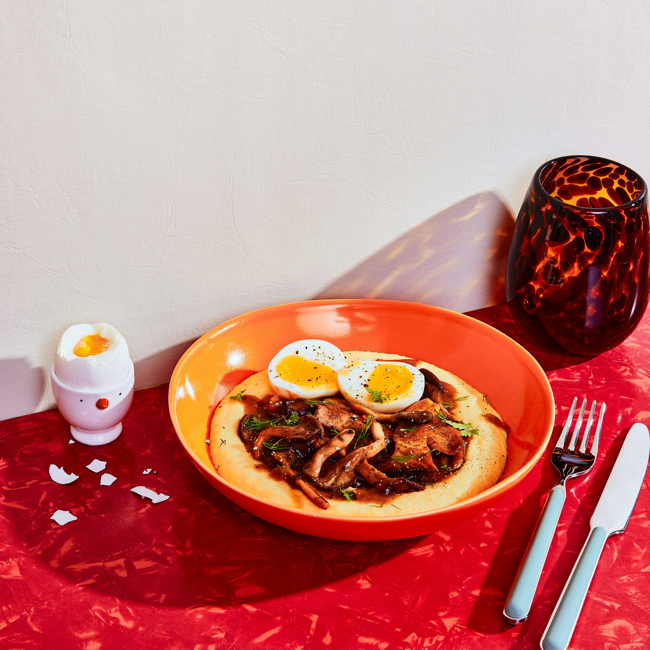 Polenta crémeuse, champignons en sauce à la bière, œufs mollets