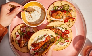 Tacos garnis de filet de flétan, salade de concombres et radis, et crème d’avocat
